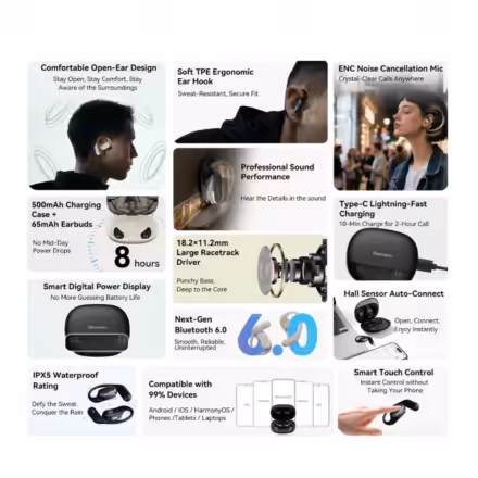 Los Airbuds 300 están pensados para acompañarte en el día a día con total comodidad, ya sea en el trabajo, paseando o entrenando. Su diseño ergonómico y ligero permite llevarlos durante horas sin molestias, mientras que la conectividad Bluetooth 6.0 ofrece una conexión estable y rápida en cualquier situación. Gracias a la compatibilidad con AAC y SBC, garantizan una experiencia de sonido equilibrada tanto para música como para llamadas.