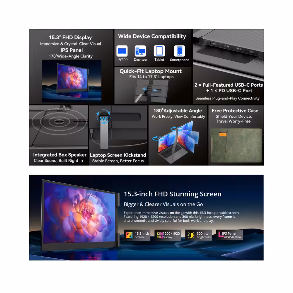 El Blackview SCM8 es una pantalla portátil de 15,3″ Full HD que transforma tu portátil, PC o tablet en una estación de trabajo multipantalla, ideal para productividad, edición, programación o entretenimiento. Con un grosor de solo 9,1 mm y un peso de 800 g, destaca por su portabilidad extrema, lo puedes llevar fácilmente en tu mochila o maletín sin ocupar apenas espacio.