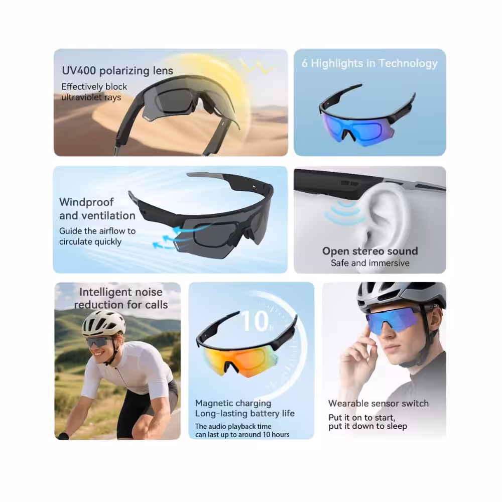 Las Blackview D2 combinan comodidad, estilo y tecnología para ofrecer una experiencia auditiva completamente manos libres. Equipadas con altavoces de 15.4 mm y 50 mW, proporcionan un sonido estéreo abierto ideal para escuchar música mientras realizas actividades o deportes al aire libre, mantener llamadas claras o interactuar con el asistente de voz sin aislarte del entorno. Con lentes UV400 polarizadas que protegen la vista.