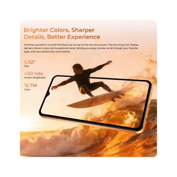El dispositivo cuenta con una pantalla IPS LCD de 6.52 pulgadas con resolución HD+ y brillo aproximado de 450 nits, ofreciendo una visualización cómoda para redes sociales, vídeos y navegación diaria. Gracias a su formato de pantalla 20:9, el smartphone ofrece una experiencia más inmersiva al consumir contenido multimedia.